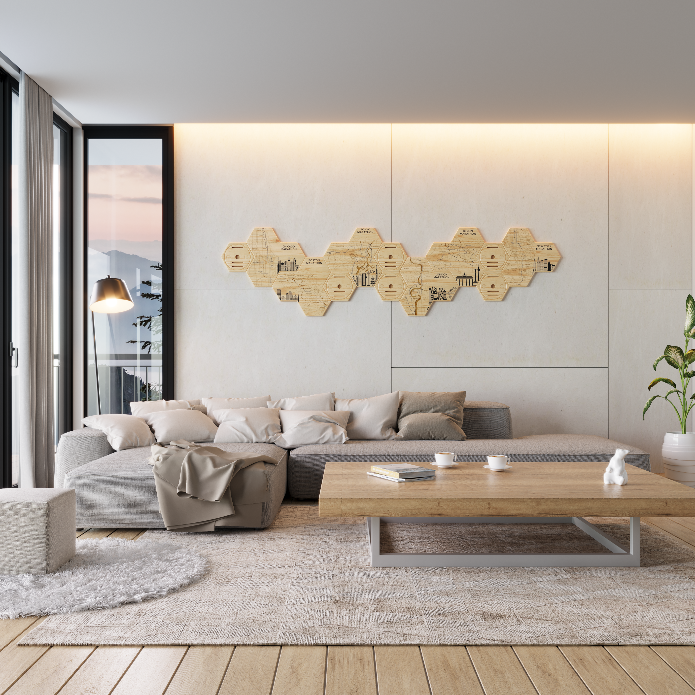 A unique combination of different manufacturing processes ensures detailed map that shines in any spaces.